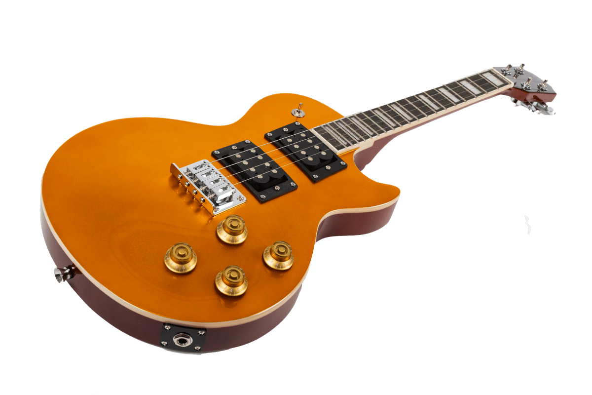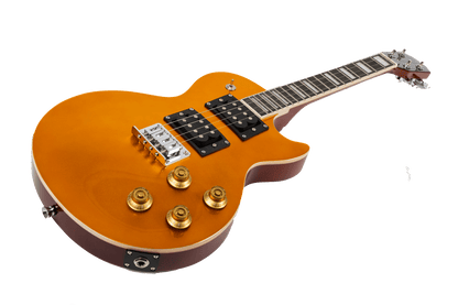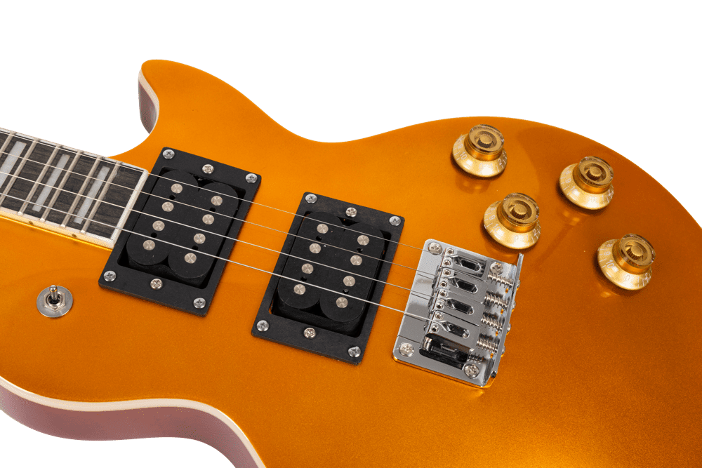 Premium Features: Tenor ukulele, electric ukulele, metal strings, solid body, single cutaway, vintage gold, mahogany body and neck, black veneer headstock, bound fretboard, bone nut, zero fret, inlay position markers, side position markers, closed geared tuners, ABS binding, retro knobs, dual humbucker pickups in HH configuration, two volume controls, two tone controls, three-way switch, hardtail fixed bridge.