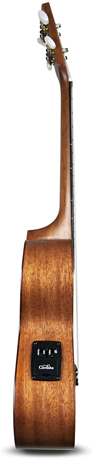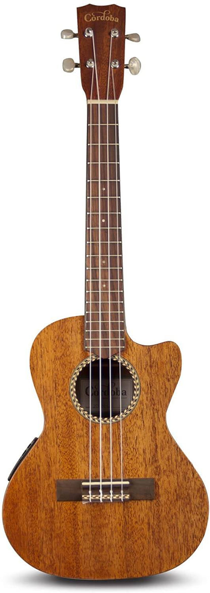 Córdoba ukuleles capture the charm of traditional Portuguese ornamentation and exotic woods. Completely handmade, the 20TM-CE is a tenor sized ukulele with a solid mahogany top and mahogany back and sides. It features a soft cutaway and Córdoba electronics so that you can plug and play.