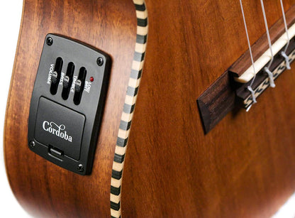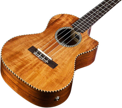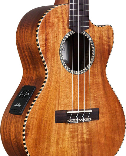 The 25 Series embodies the charm of traditional ukulele ornamentation combined with the striking natural figure of acacia, an exotic tropical wood closely related to koa, the beloved tonewood native to Hawaii. All 25 series ukuleles feature a solid exotic acacia top and figured acacia back and sides, providing a bright, round and familiar voice. A wooden rope-style top binding and herringbone rosette and tie block further the unique visual appeal, while hearkening to the ukulele's origins. Other features include a thinly applied satin finish, bone nut and saddle, and Aquila strings. 25 Series ukuleles are available in soprano (25S), concert (25C), tenor (25T), and tenor cutaway-electric (25T-CE) sizes.