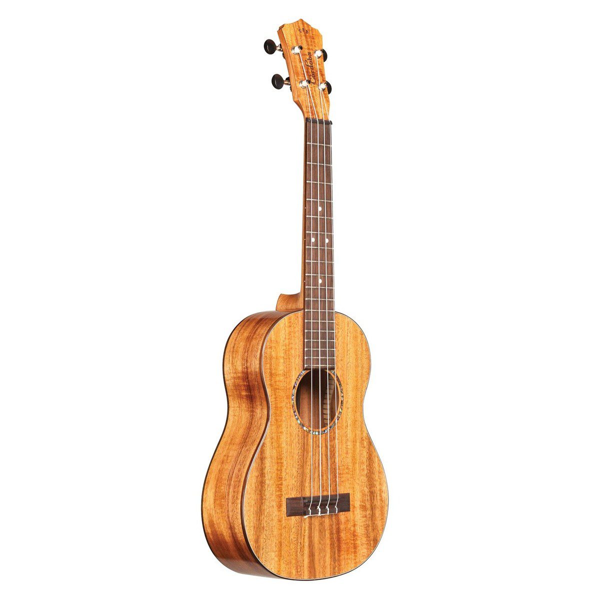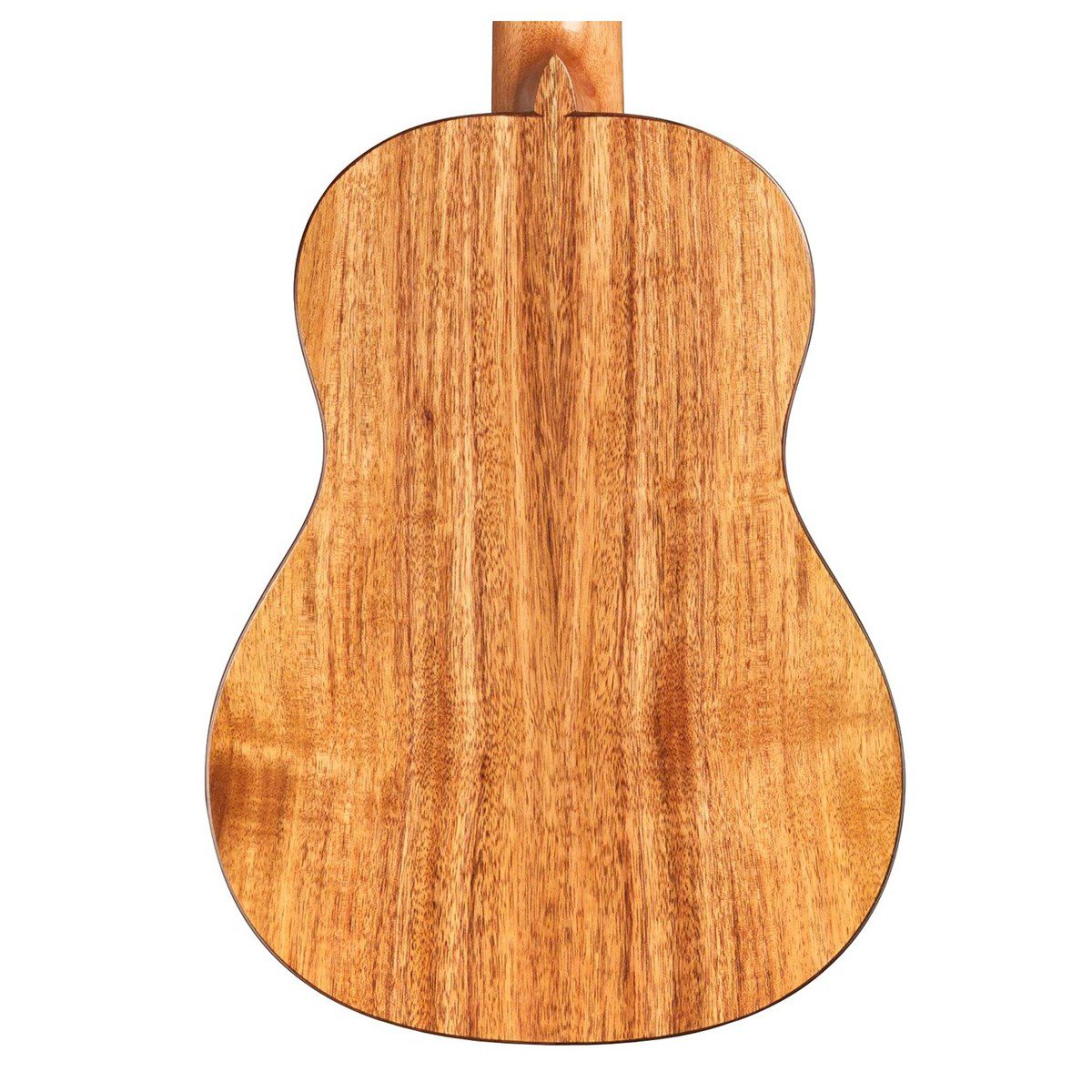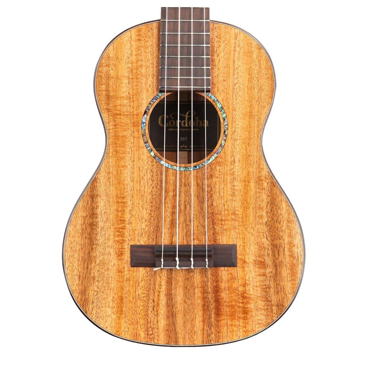 The 35T tenor uke features all solid acacia for the top, back, and sides which give it a clear, bright tone, and distinctive figured appearance. The 35T also features a beautiful rosewood bridge, binding, and fingerboard. The styling is refined and sleek, using abalone for the inlaid rosette and rosewood for the binding, capped off with Cordoba’s signature elevated headstock with a figured acacia overlay. The finish is a gloss polyurethane, applied as thinly as possible for maximum resonance. Other features include a black TUSQ® nut and saddle, chrome Grover tuners, and a Cordoba polyfoam case.
