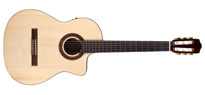 Based on Córdoba's top-selling C5-CE, the C5-CE Spruce adds a new option to a fan favorite. A soft cutaway provides easy access to the upper register, and a Fishman Presys II preamp amplifies your signal for stage and studio. Perfect as a first nylon-string guitar and ready for gigging, this lightweight model is built with a solid Engelmann spruce top and mahogany back and sides to produce a clear, powerful tone with beautiful sustain. Handmade in the traditional Spanish style, the C5's carved headstock, hand-inlaid wood rosette, Indian rosewood binding, Savarez strings, and glossy PU finish result in a guitar that truly stands out from all other entry-level options. A lightweight adjustable truss rod is built into the neck for stability. Available in Natural finish with solid Engelmann Spruce top.