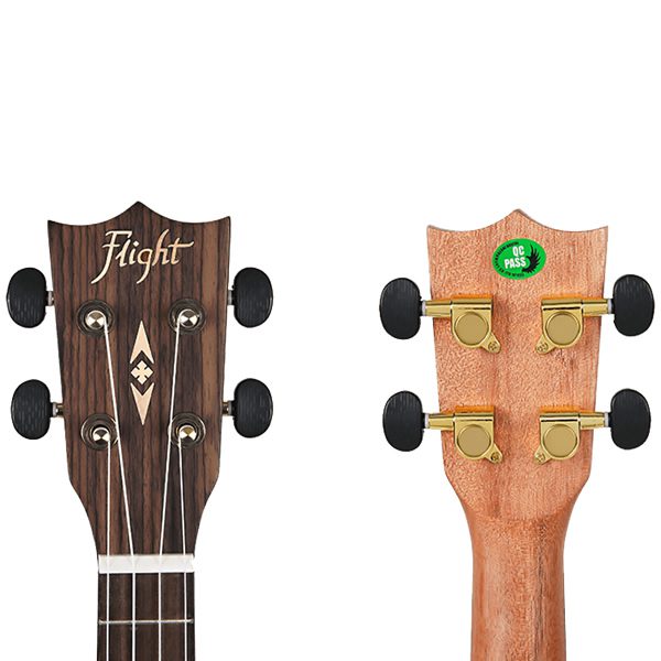 A combination of African okoume and walnut is used for the DUC410's neck and fingerboard. The combination of these materials is a great way to ensure stable intonation across the fretboard, while also being gentle on the hands and looking great. While a nut may seem like a small part, its role in the sound of an instrument is crucial. Neither the nut nor the saddle on the DUC410 is made of plastic but from the bone. The exquisite details on this ukulele only add to its uniqueness. Flight ukuleles are equipped with geared tuners on the headstock to ensure that they remain in tune.