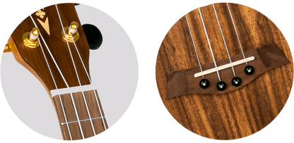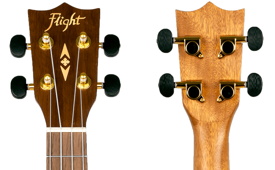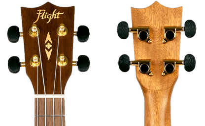 African okoume and Walnut used in the construction of the DUC440's neck and fingerboard. In addition to being easy on the hands, the combination guarantees stable intonation across the fretboard. Even though nuts may seem minor, it has a huge impact on the quality of sound an instrument produces. The DUC440's nut and saddle made of bone rather than plastic. One of the things that make this ukulele so special is its intricate detail. Featuring a stylish headstock adorned with gold tuners that stay in tune, this ukulele is manufactured with the highest quality materials.