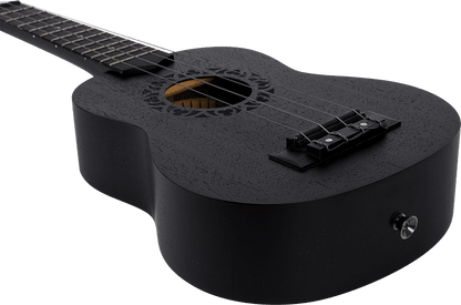 Premium Features: Black Flight Strings, Arched Back, Satin Black Tuners, Black Nut and Saddle, Laser Engraved Rosette, Side Position Markers, Black Flight Nylon Strings.
