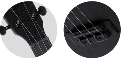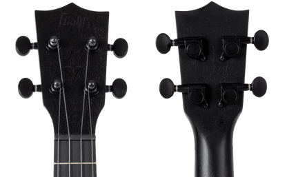 The Flight uses laminate Sapele for the Flight NUS310 Soprano. Sapele is a light hardwood from tropical Africa having a golden to dark reddish-brown colour. The constructors paint it black to produce a different and striking look. It is a close relative of mahogany, its grain is interlocked and has a uniform texture with a good natural luster. Its natural resonance is boosted and concentrated by the arched back of this ukulele, yielding a clear and bright tone. The rosettes in all our ukuleles are drawn by hand and engraved by laser. The Flight put a high-quality black PPS nut on the NUS310 Blackbird Soprano, to keep the uniform black look of this ukulele.