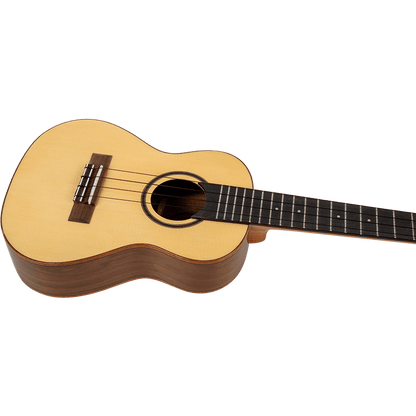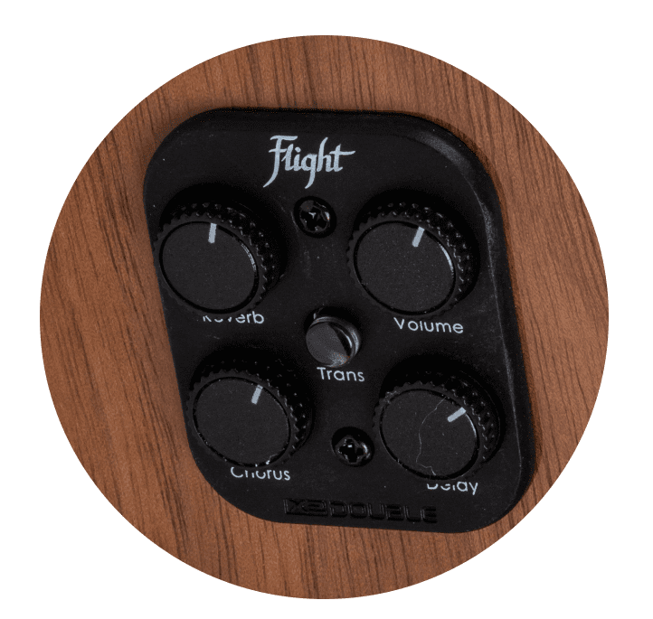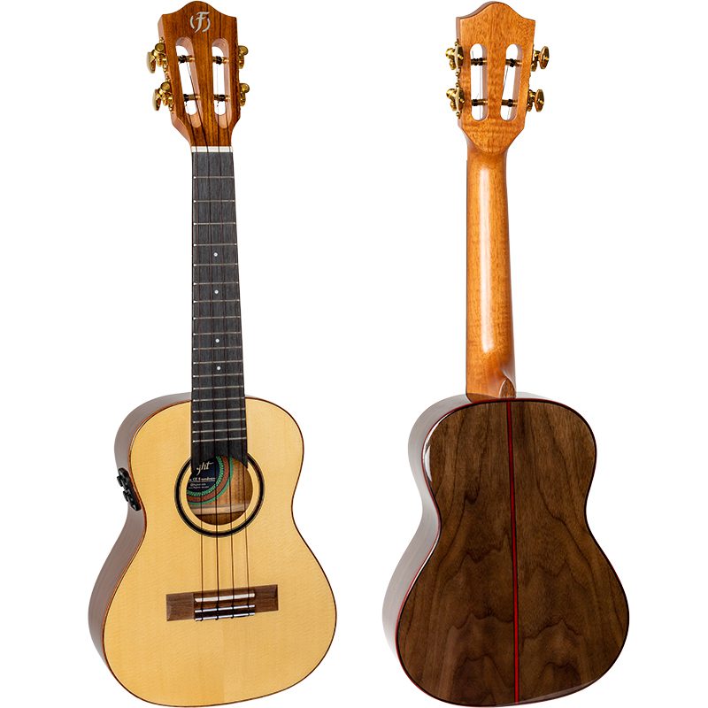 Flight Sophia Concert Electro Ukulele players adore spruce because of its open projection and length. The all-solid spruce top is combined with a lovely laminate walnut back and sides for a warmer appearance and rosewood-like tone. Combining the two kinds of wood produces a rich tone with a range of resonance. Professional musicians and novice players alike praise the Worth brand of strings. The quality and projection of these fluorocarbon strings bring out the lovely tone of these instruments, making every note a true pleasure to play. This model is equipped with a Double brand B1U pickup. These pickups are praised for their ease of use, and their clear sound and volume control. Battery changes are quick, and there are no unsightly battery blocks to add to the ukulele's weight and bulk.