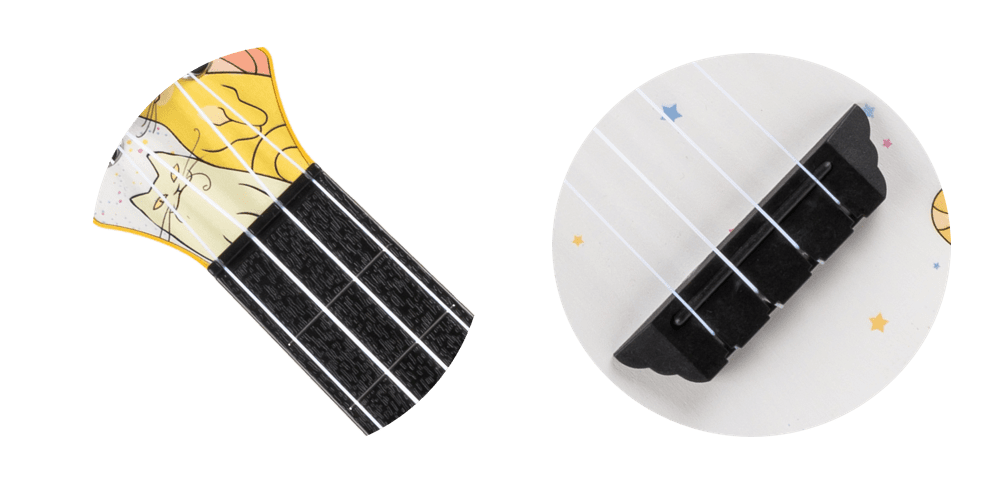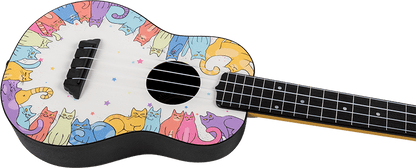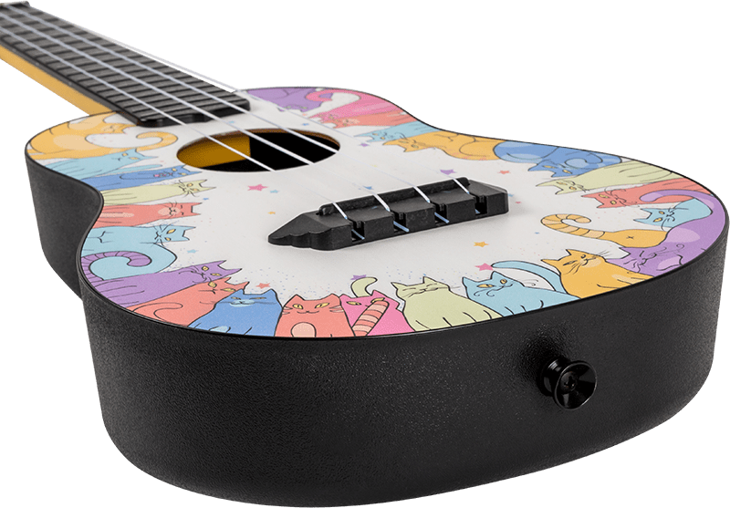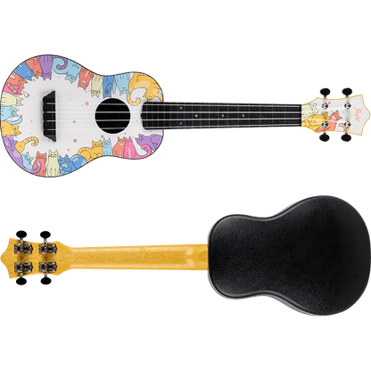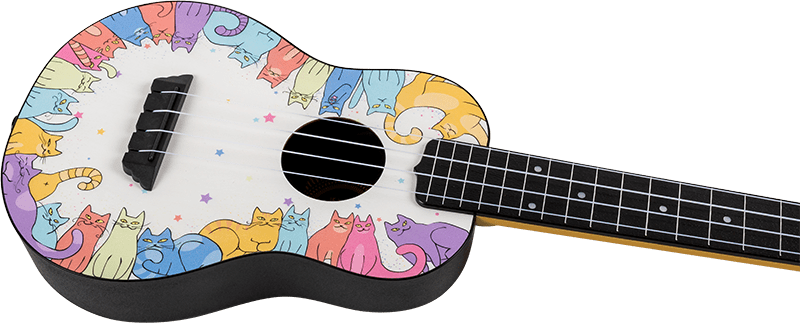 Premium Features: Kitty Print, Zero Fret, Wooden Top, Arched back, Open Geared Tuners, ABS Fretboard, Side Dots, Strap Button, Aquila Strings.