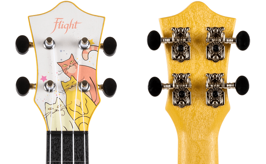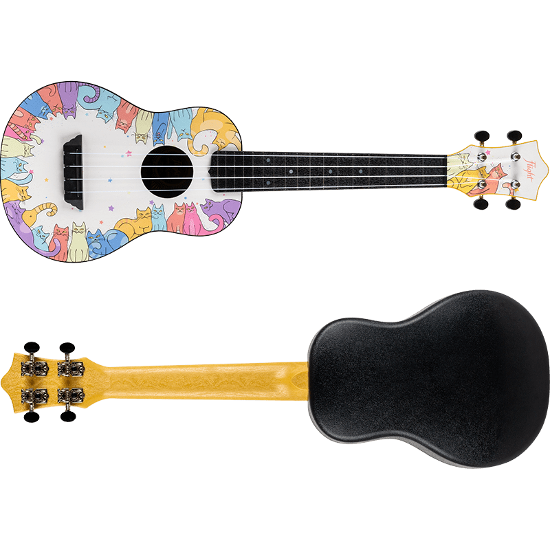 Flight TUC-KITTY Concert Travel Ukulele is introduced for cat lovers. The top of the TUC-KITTY Uke is made of linden wood, and the body, neck, fretboard, and bridge are made of ABS plastic. If you want a solid and quality ukulele that reveals that you are a cat lover, you can choose Flight TUC-KITTY Ukulele. The soundboard on the TUC-KITTY is made of laminated linden wood. The vivid tone of linden is distinctive. On the soundboard and headstock, the TUC KITTY features the whimsy prints of cartoon cats.