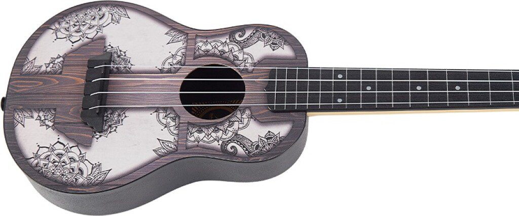 Premium Features: Black Soundboard, Gold Mandala Wood Print, Zero Fret, Wooden Top, Arched back, Open Geared Tuners, ABS Fretboard, Side Dots, Strap Button, Aquila Strings.