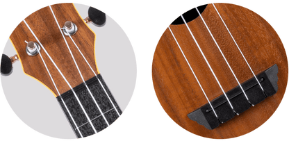 Premium Features: Laminate Acacia Soundboard, Zero Fret, Wooden Top, Arched back, Open Geared Tuners, ABS Fretboard, Side Dots, Strap Button, Aquila Strings.