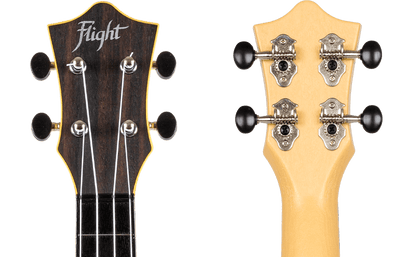 The Flight TUS55 Travel Ukulele uses the zero fret and flexible saddle, maintaining a low string movement and a point intonation. The Ukulele Flight Travel has a rounded back that can make it harder for certain players to carry. To make it easier to hold, Flight introduced a single strap button to the travel series. Flight offers a range of Ukulele Straps that will end up making your ukulele perfect support. The headstock veneer is made from Amara laminate and fits the ukulele soundboard. A well-built headstock with geared tuners is included in each Flight ukulele. Every Flight ukulele includes a gig bag. A blue denim gig bag adds some style and distinguishes the bag from the regular black gig bag that everyone else seems to prefer.