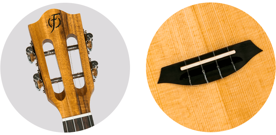 The Flight Victoria has a compensated saddle and a real bone nut. With a modern and smooth scalloped cutaway, you can go as far as you want without affecting the sound as much as conventional cutaways do. This ukulele has an ebony armrest that provides a flat surface for your playing arm to rest on, making it as comfortable as a Victorian couch and also looks sleek. Victoria has a slotted headstock as a higher-class instrument, which adds glitz to its often striking and distinctive appearance.
