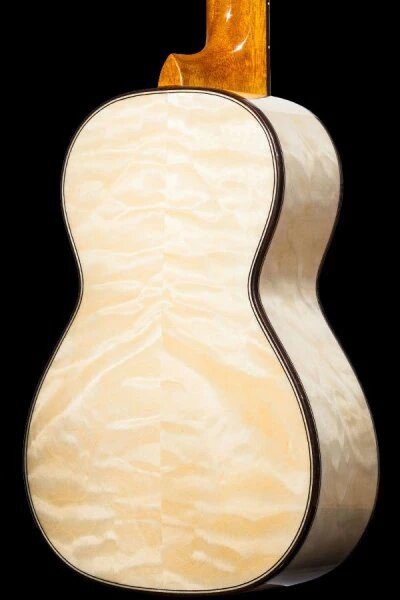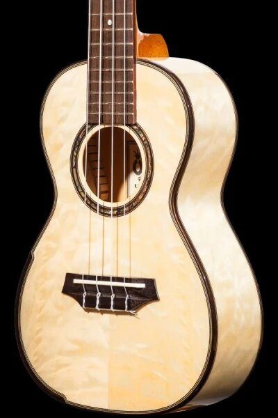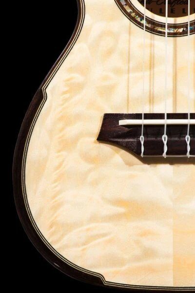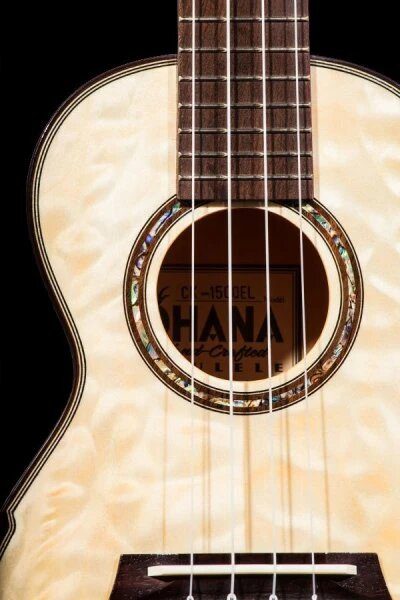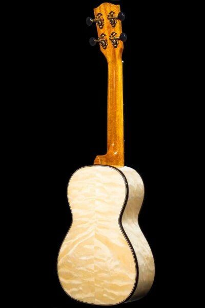 This gorgeous instrument is the best of both worlds— lovely thanks to the quilted eucalyptus and sturdy due to the laminate build. We’ve carried over the dark hardwood binding, with a simpler black/white purfling and faux comfort edge. A wood and abalone inlay completes the rosette for this model— a perfect pairing for the gold and platinum hues of the eucalyptus. Grover geared tuners make getting to pitch a breeze, paired with black buttons to contrast the headstock veneer.