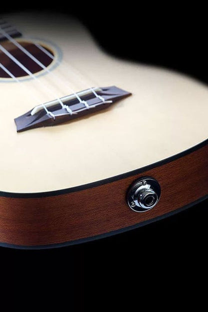 The Ohana CKS-22E thin body concert ukulele features a solid Spruce top, Mahogany back and sides, and an under-saddle passive pick-up, great lightweight electro uke for travelling. Plug in and play anywhere. See below for specs.