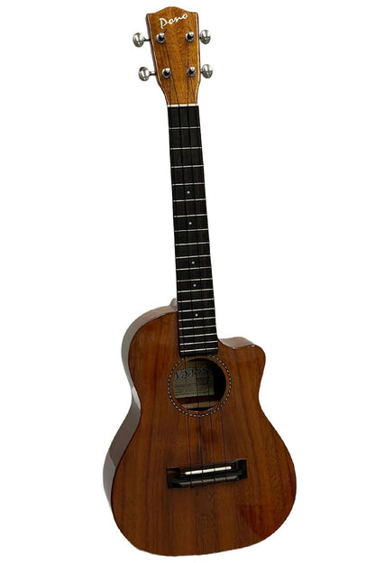 All-solid koa electro ukulele in tenor size. Features a cutaway, Aquila black strings and rosewood bridge and fingerboard.