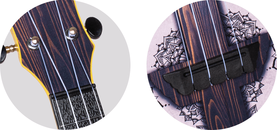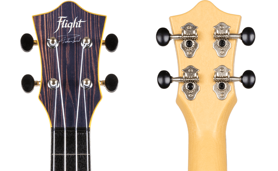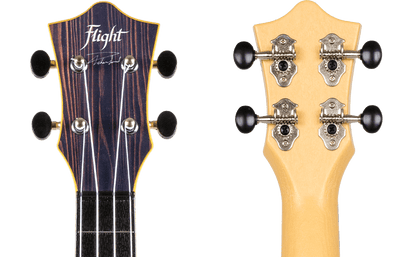 This ukulele features ABS plastic in its neck and fingerboard. This is an ideal ukulele because they are not susceptible to any alteration in the climate. On travel ukuleles, you will never encounter a sharp fret or a twisted neck. The neck has a wood finish that allows the instrument to sound different from a plastic ukulele. The zero fret and customizable saddle on Flight travel ukuleles hold string action low and intonation on point. Since a plastic ukulele does not respond to weather as a wood ukulele does, you should never have to fix the saddle again. a single strap button is added to the travel series to make them easier to hold. All Flight ukuleles have a custom-designed headstock with geared tuners that stay in tune at all times.